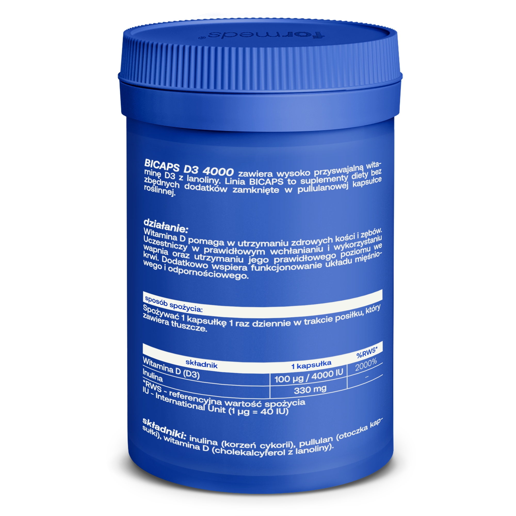 Składniki: inulina (korzeń cykorii), pullulan (otoczka kapsułki), witamina D (cholekalcyferol).