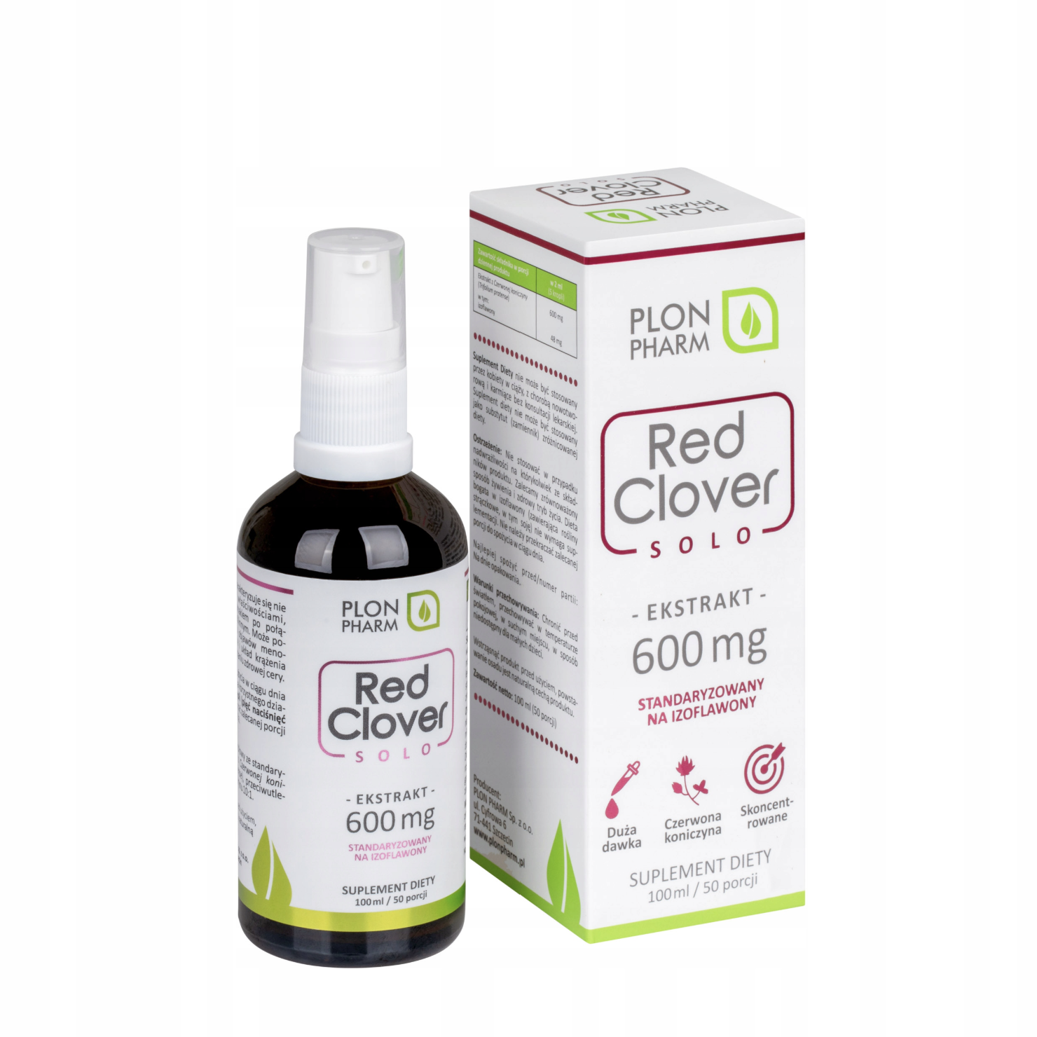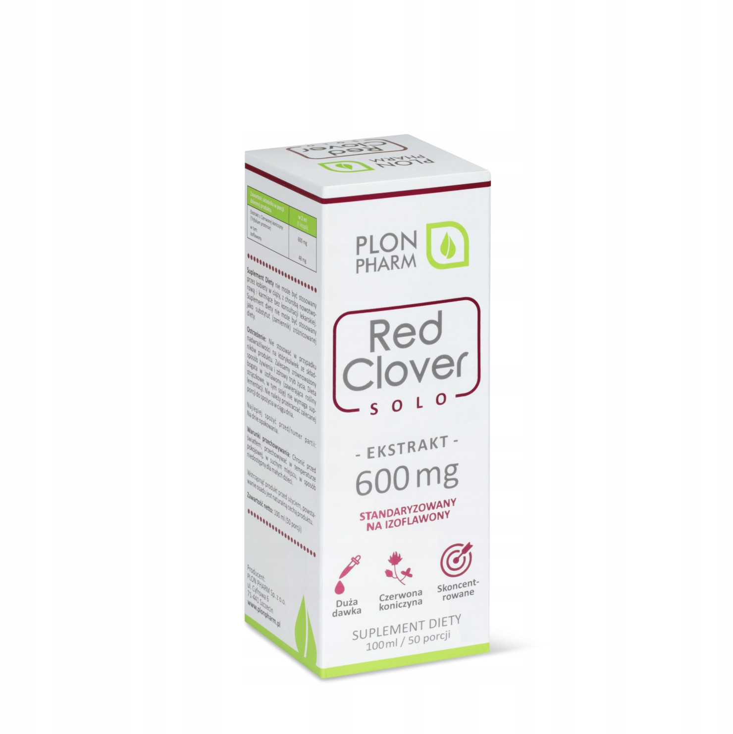 Plon Pharm Red Clover (Czerwona Koniczyna) 600 mg w postaci kropli wodno-glicerolowych, zawierających 600 mg najwyższej jakości ekstraktu z koniczyny czerwonej w dziennej porcji.